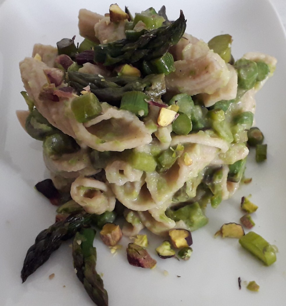 Torchietti di grani antichi con crema di cannellini e asparagi