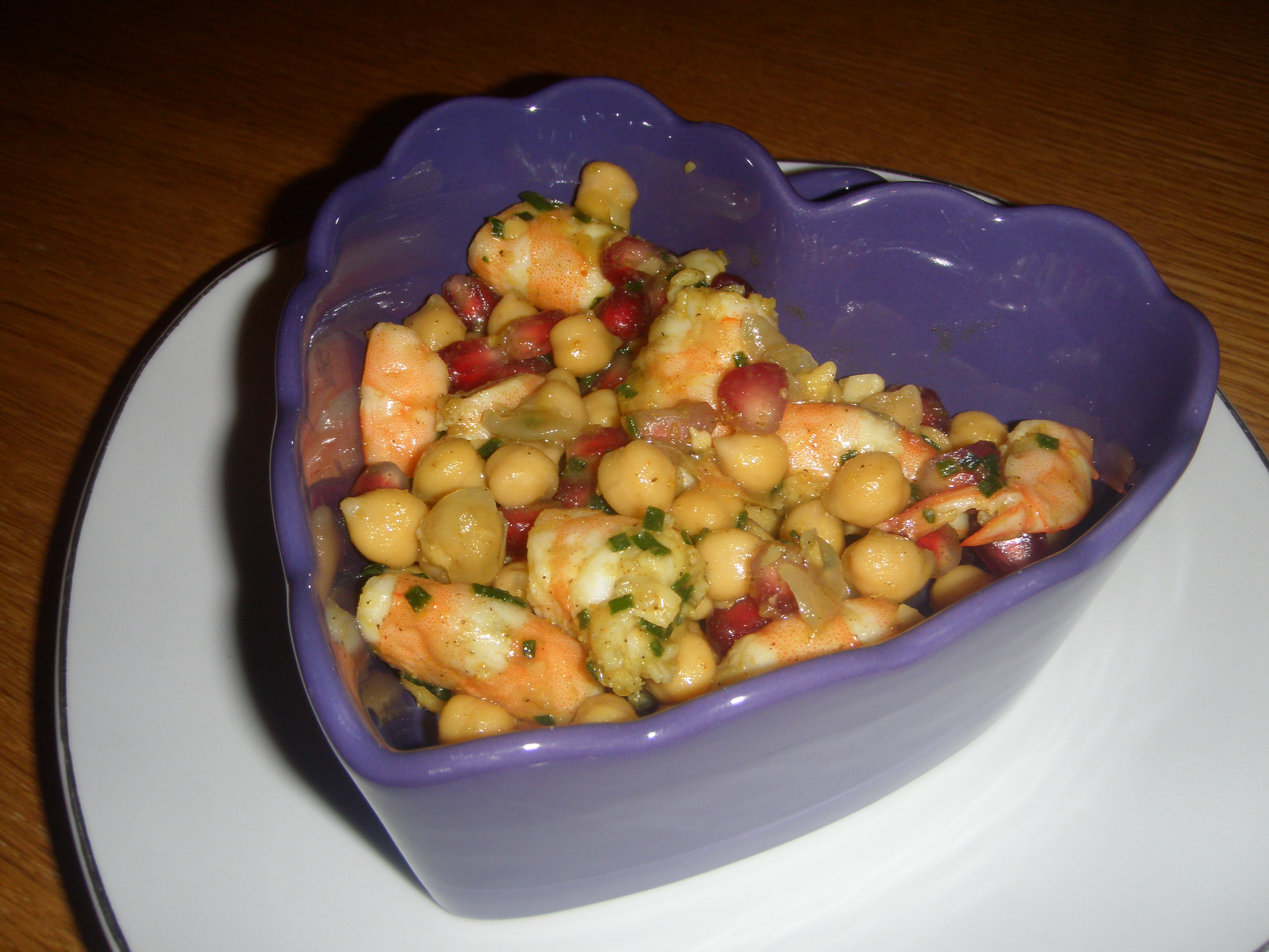 In un piatto aprire a metà il melograno e sgranarlo, per la ricetta è sufficiente metà dei chicchi ma se vi piace potete anche abbondare, come avrete capito di sicuro non vi farà male! Pulire le code di mazzancolle e tagliarle in tre parti. In una scodella spremere il succo del limone ed emulsionare con l’olio il sale il pepep e il curry. In una terrina unire ceci, melograno, mazzancolle, versare il condimento ed aggiungere l’erba cipollina tagliata a pezzettini. Mescolare e lasciare riposare in frigo, se possibile almeno qualche ora, meglio ancora se si prepara il piatto il giorno prima; è comunque possibile consumare l’insalata subito, i sapori saranno solo meno amalgamati.