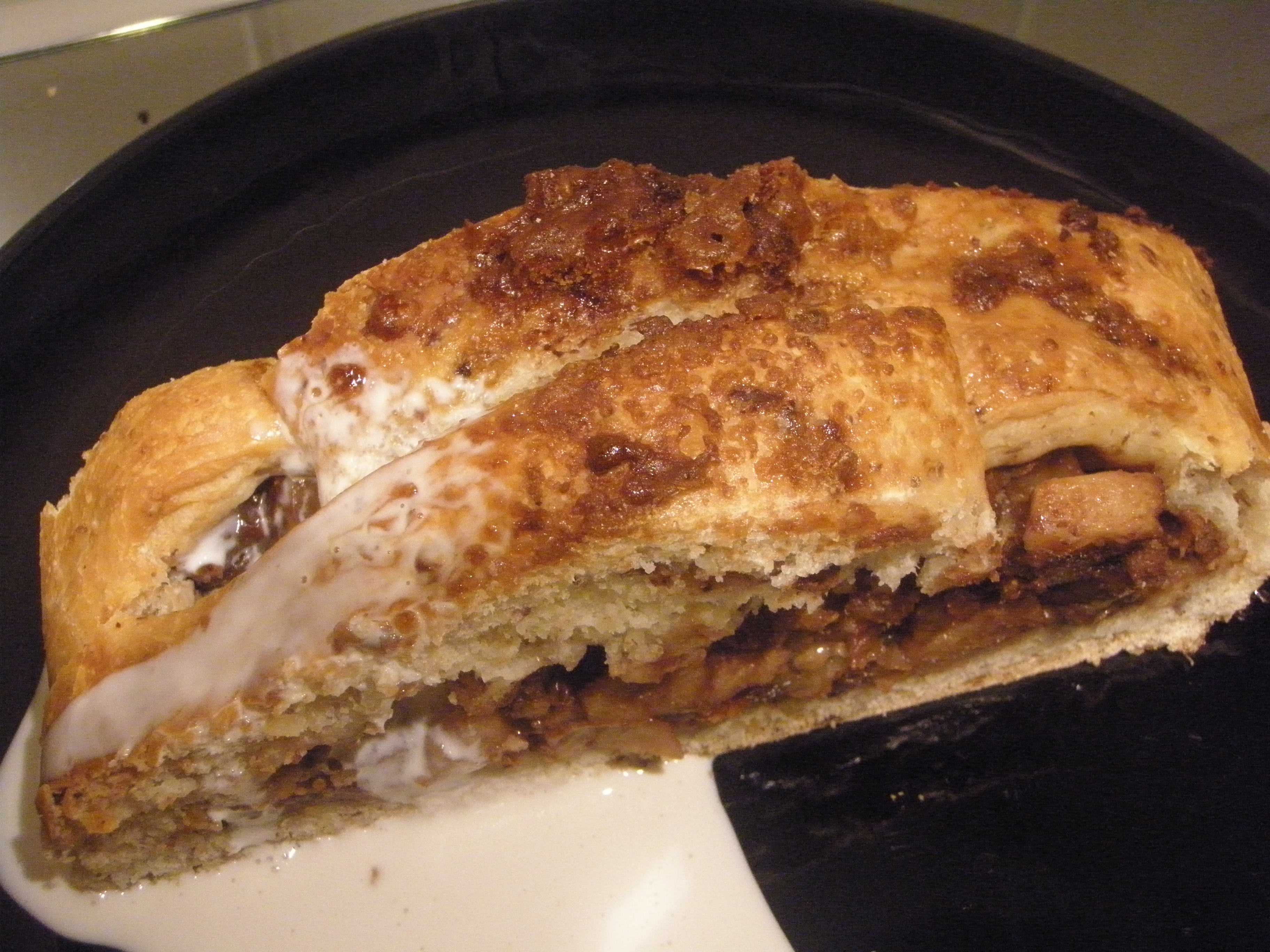 Porre la pasta su un foglio di carta forno e con il mattarello stendere la sfoglia sottile (3-5mm). Versare il ripieno al centro , lasciando due ampie bande laterali libere; incidere le bande laterali a mo’ di frange quindi ripegarle verso il centro come per intrecciare la pasta per fare una bella treccia ripiena gigante!