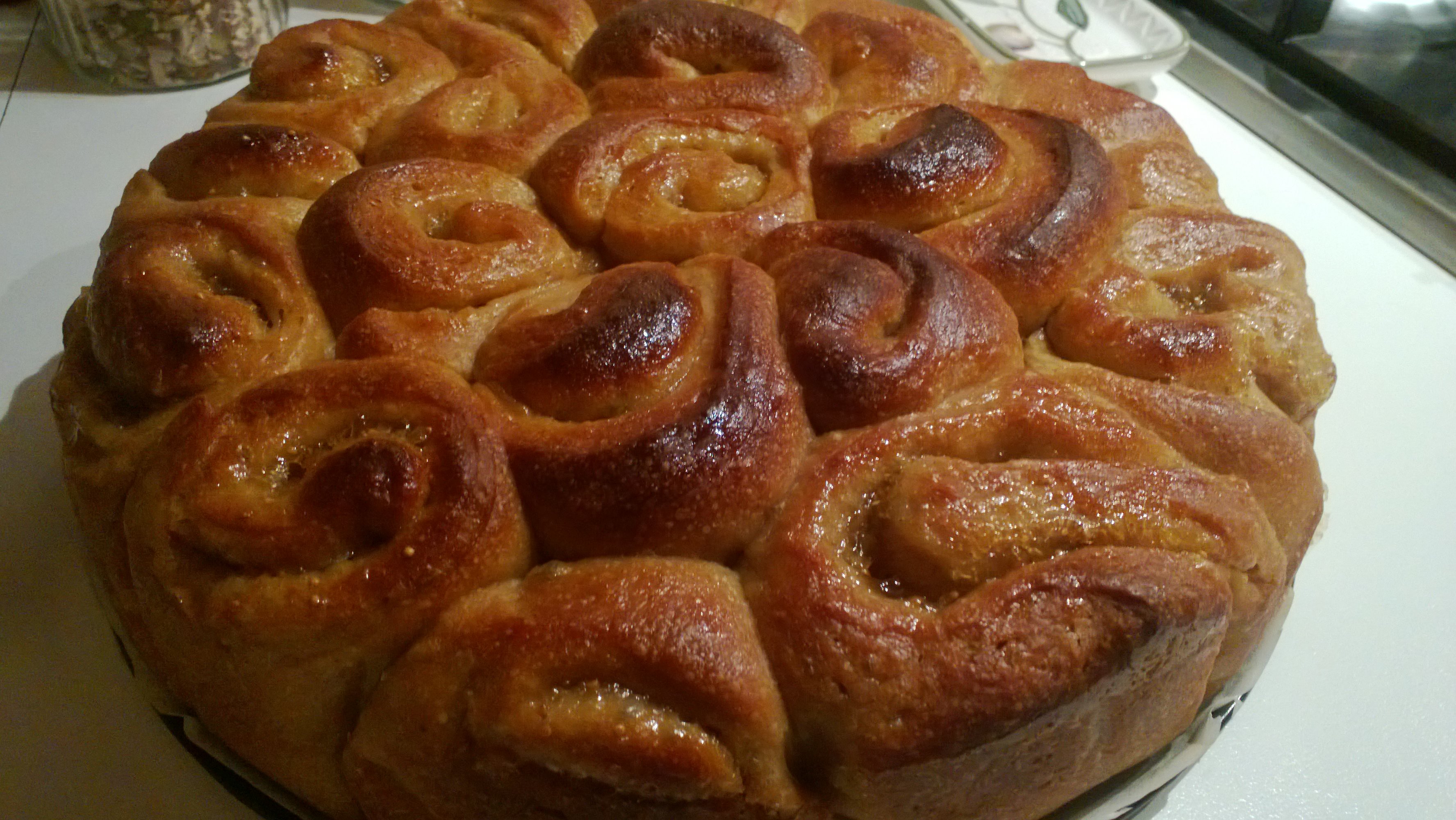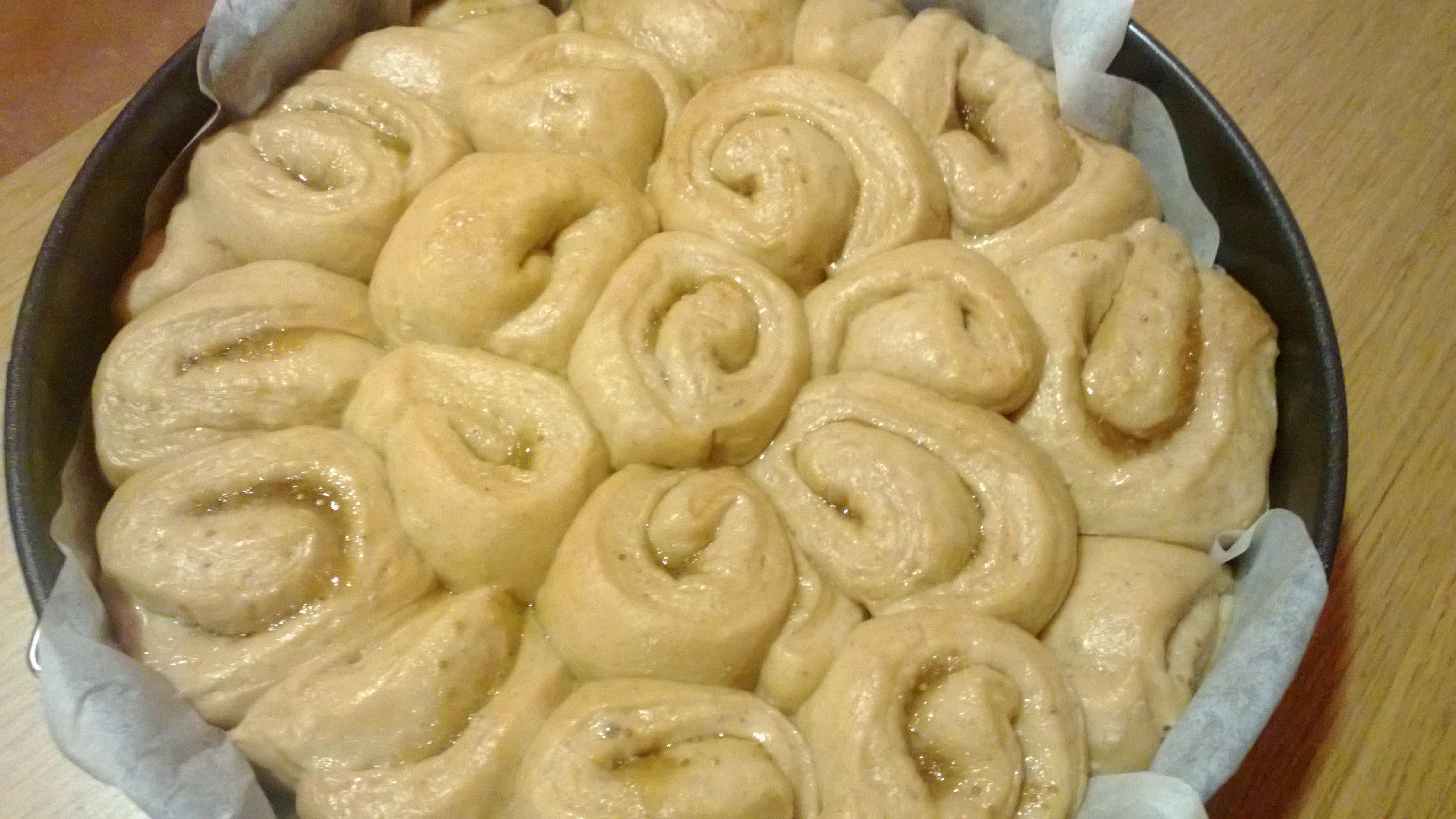 Il mattino dopo, prendiamo l’impasto, lo schiacciamo leggermente, lo tagliamo in 3-4 panetti, e con l’aiuto di un matterello tiriamo la pasta a formare dei rettangoli e stendiamo uno strato leggero di confettura, io avevo della marmellata di fichi ma qualunque di vostro gusto sarà perfetta. Arrotoliamo l’impasto e lo tagliamo delicatamente a blocchetti (tipo girella) di 3-4cm.