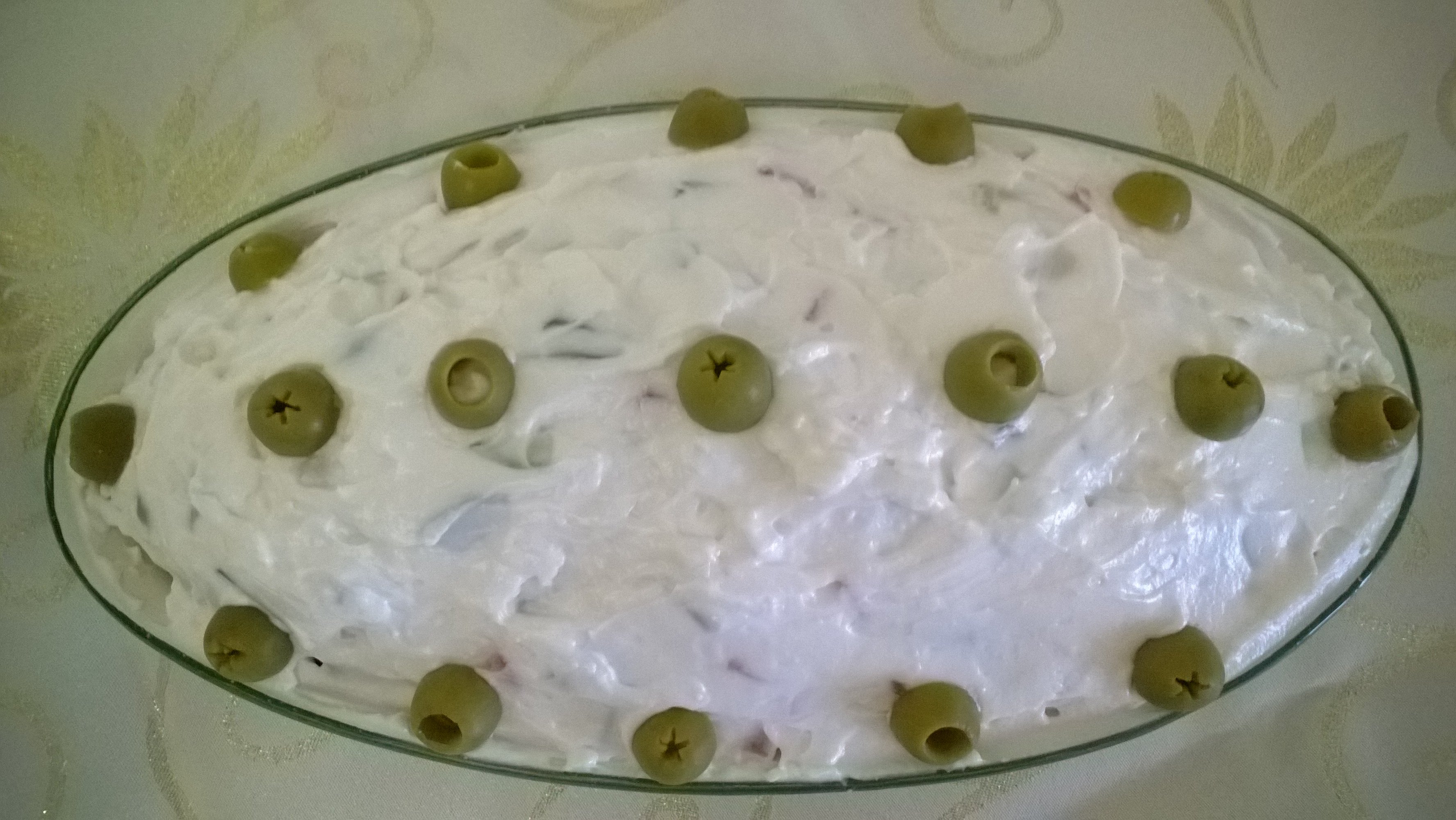 Unire circa la metà della maionese alle verdure e mescolare insieme. Trasferire in un piatto da portata oppure fare delle monoporzioni, quindi ricoprire con la restante maionese e guarnire, io avevo a disposizione delle olive denocciolate ma potete usare cetriolini oppure altre verdure. Lasciare riposare in frigorifero per almeno un’ora prima di servire, meglio se la preparate la sera prima! 🙂