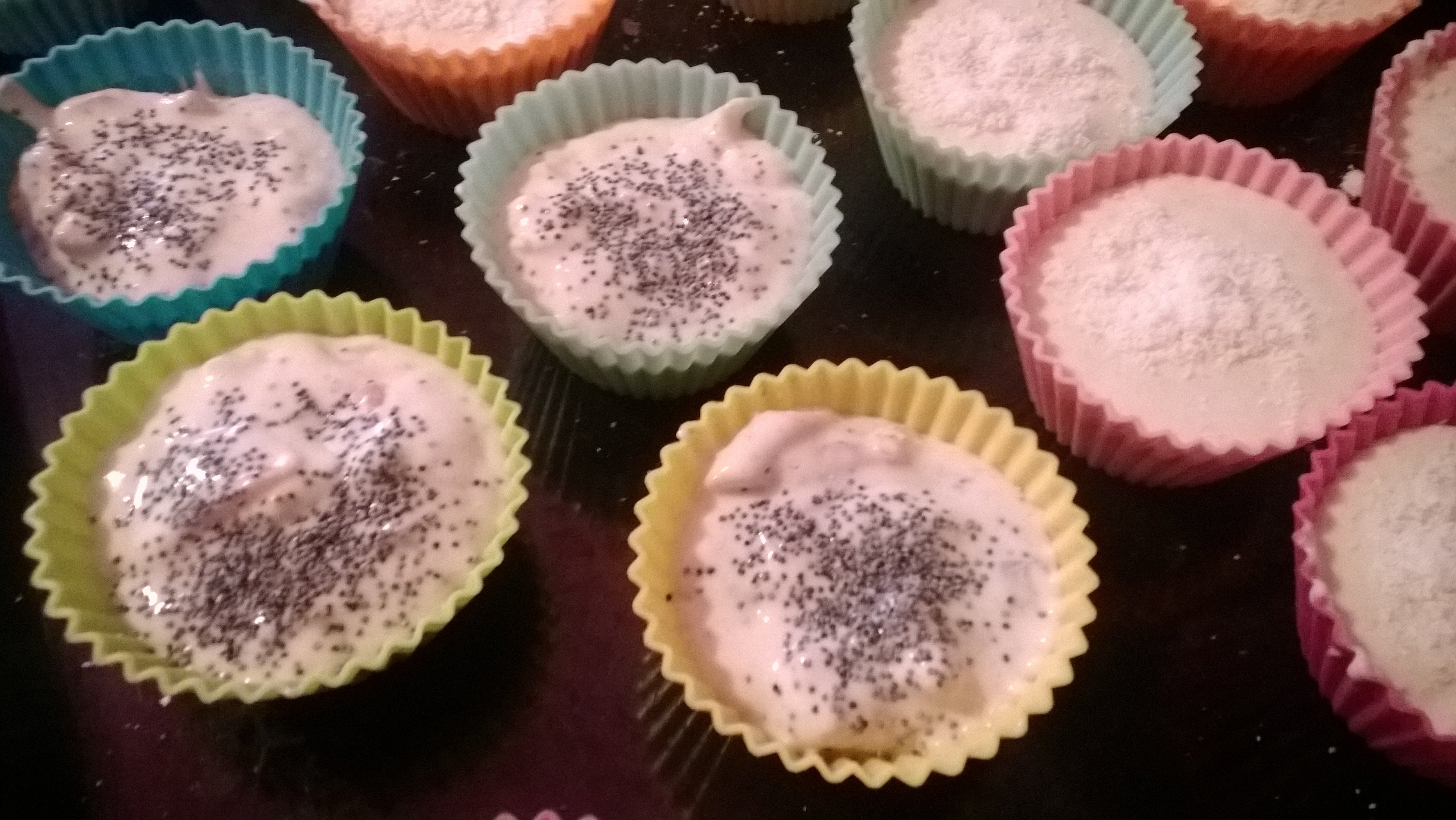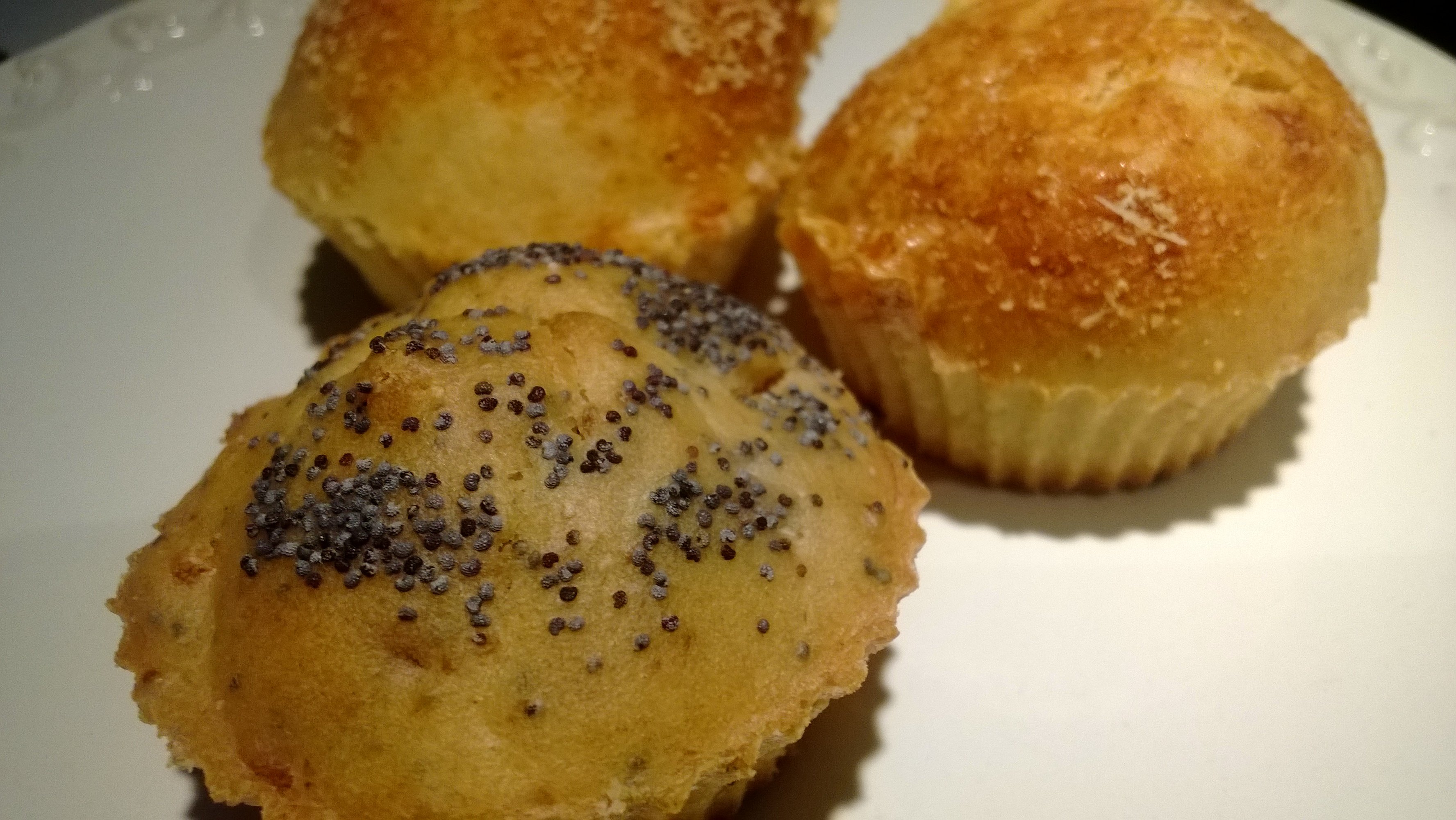 Dividere l’impasto in due parti, ad una metà aggiungeremo semi di papavero, salmone e cipolla tagliati finemente, all’altra parte il formaggio a cubetti piccoli. Quindi riempire i pirottini per i muffin, e decorare con semi di papavero quelli al salmone, con una struzzatina di grana quelli al formaggio; con queste quantità verranno circa 10-12 muffin per tipo.