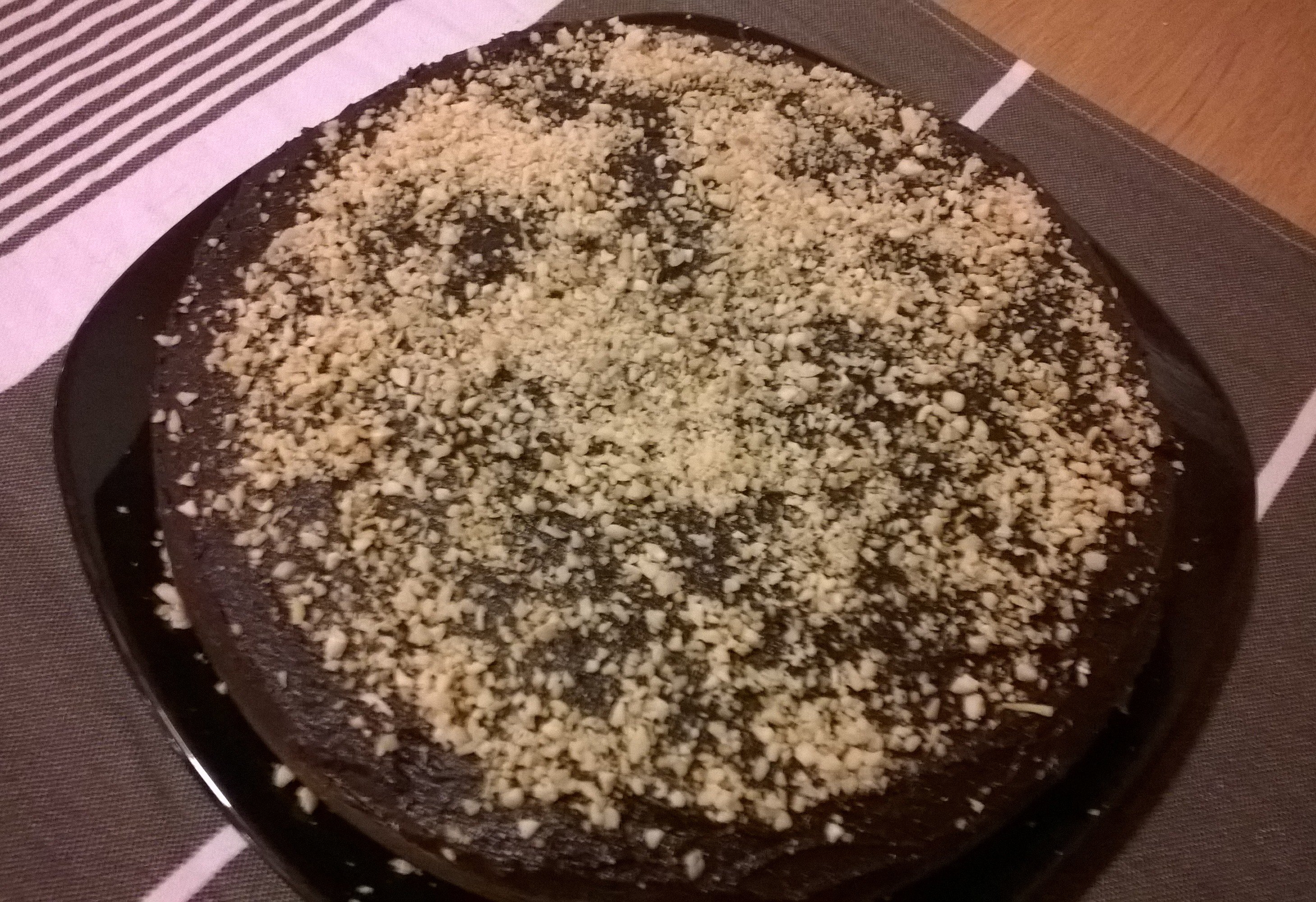 Per la guarnizione sciogliere a bagnomaria il cioccolato con un pochino di acqua, quindi stendere uno strato sulla superficie della torta e decorare con la granella … ed ora non resta che gustarla in compagnia … fino all’ultima fetta! 🙂