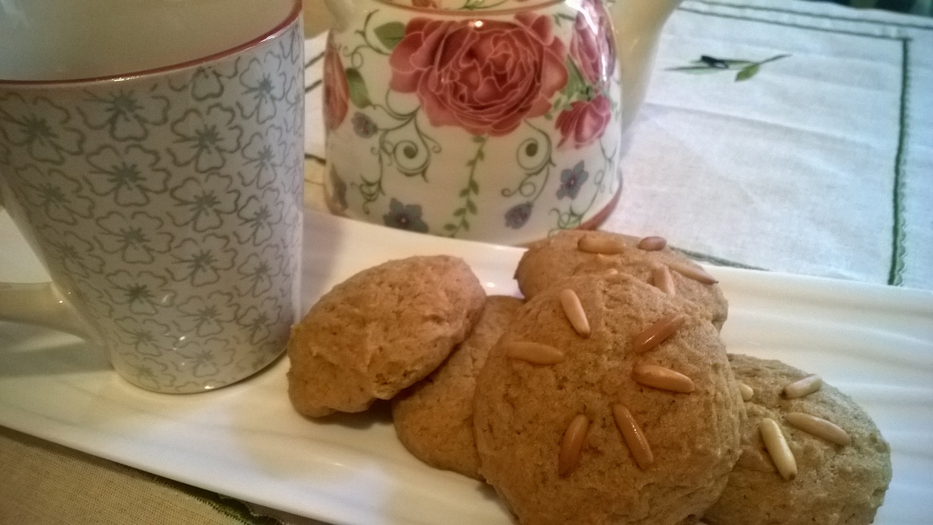 In una ciotola unire tutti gli ingredienti secchi e mescolarli con una frusta. Nel bicchiere di un frullatore unire gli ingredienti liquidi compreso il tofu e frullare fino ad ottenere una crema omogenea, quindi versarla negli ingredienti secchi e mescolare con una spatola fino ad ottenere un composto omogeneo. Stendere un foglio di carta forno su una placca, quindi con l’aiuto di un cucchiaio da gelato riempito circa a metà dosare la quantità dei biscotti e versarli sulla placca tenendoli un po’ distanziati, decorarli con pinoli e cuocerli per circa 12 min a 180°C. I biscotti devono essere appena dorati e ancora morbidi, lasciarli raffreddare … e poi gustarli! 🙂