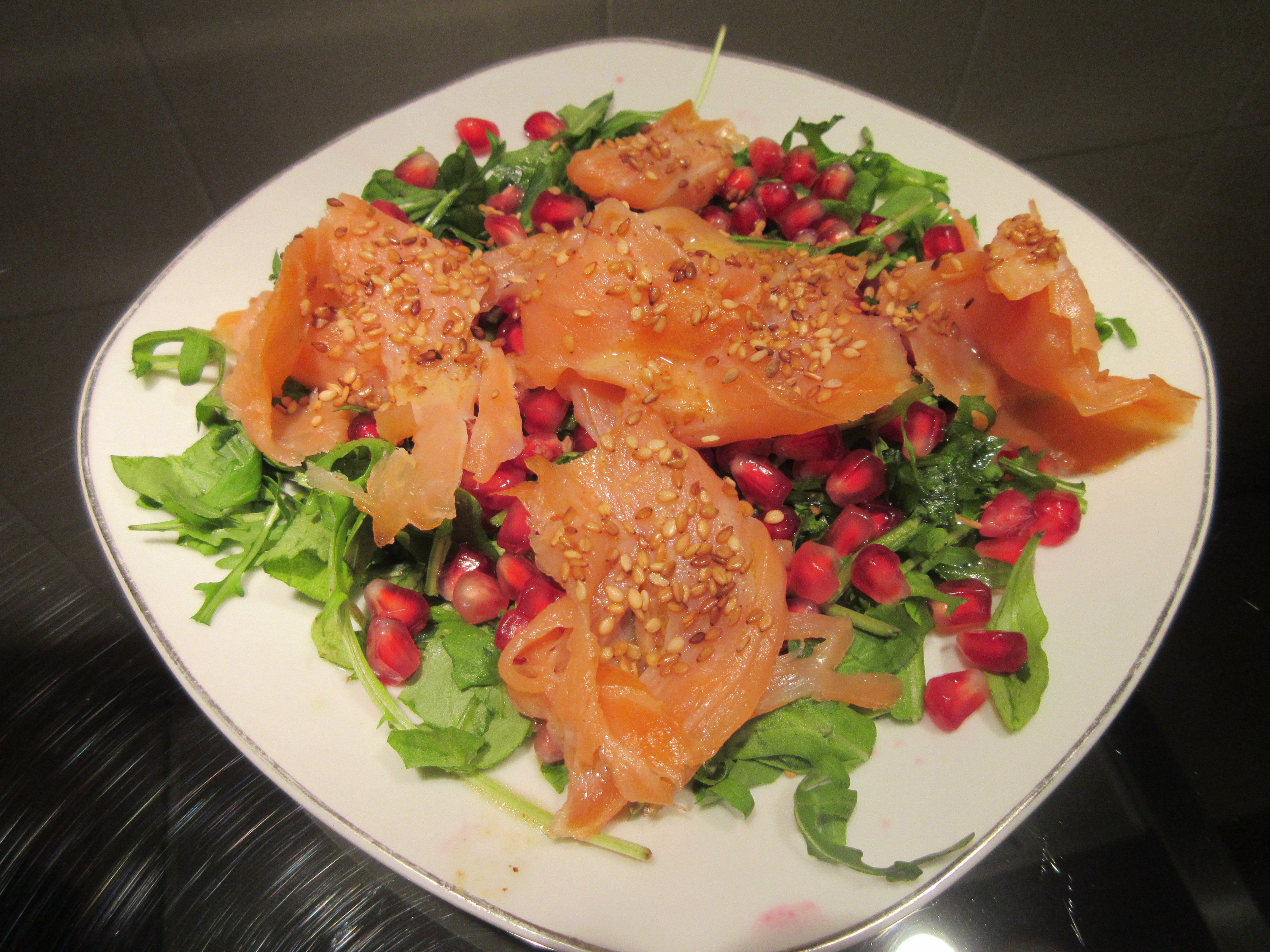 Tagliare al coltello la rucola ed adagiarla sul fondo del piatto, sgranare il melograno, quindi disporre le fettine di salmone. In un ciotolina emulsionare il succo di limone, la senape e l’olio, quindi versare sul pesce ed infine spolverare con i semi di sesamo tostati … et voilà la vostra insalatina è pronta per una scorpacciata di salute!