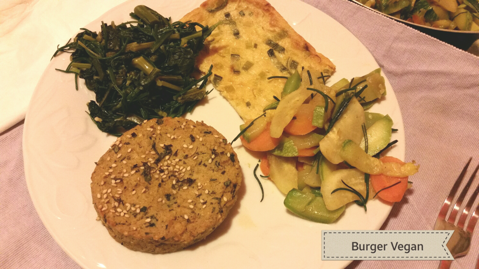 Questo è un esempio per un buon pranzo completo dato che nel burger abbiamo sia i cereali che le proteine del tempè e il contorno fornisce la fibra, le vitamine e i sali minerali.