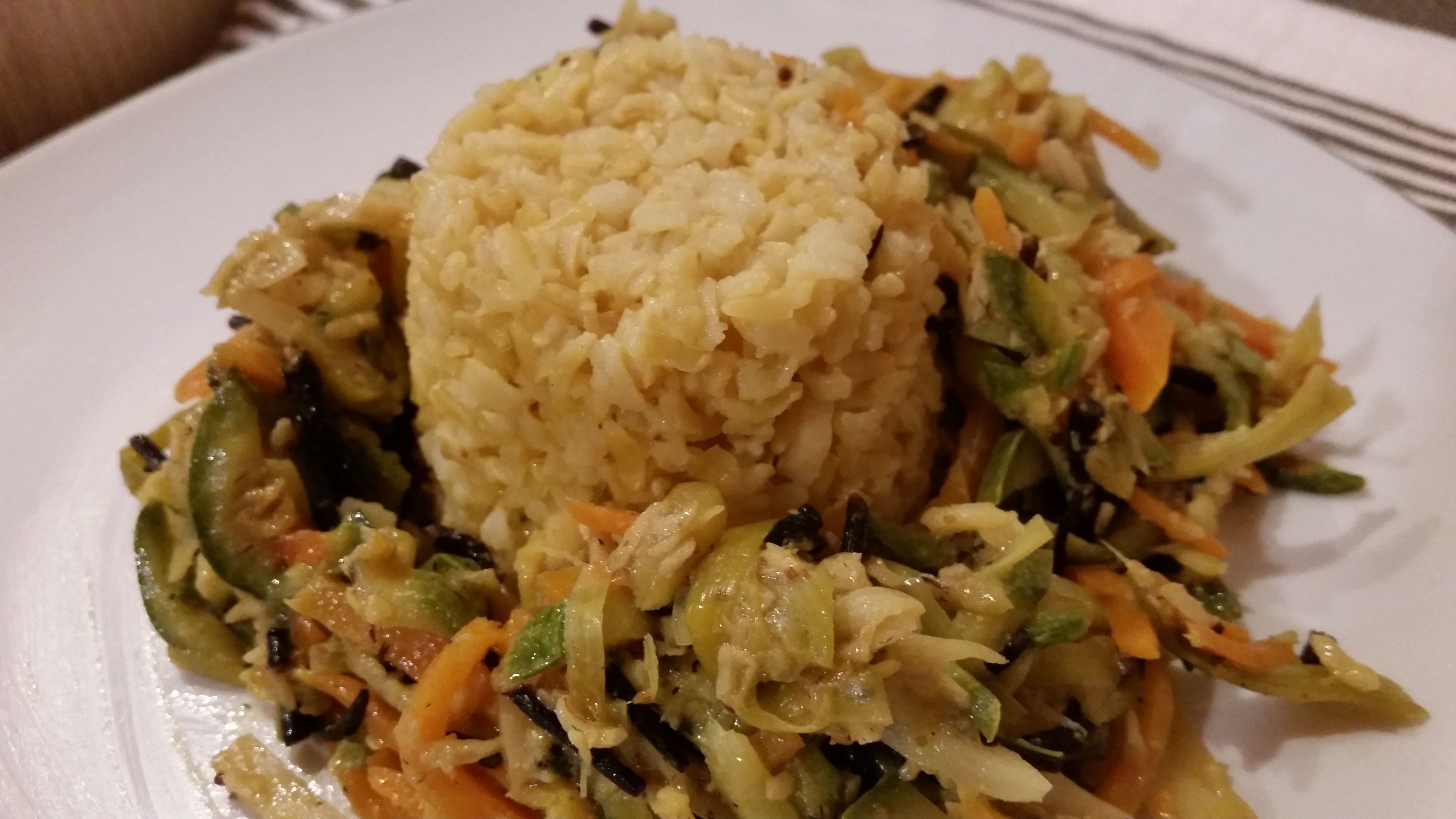 Scaldare l’olio di sesamo in una padella con il curry, quindi aggiungere il porro, saltare brevemente un minuto, aggiungere le carote e saltare qualche minuto finchè non cominciano ad ammorbidirsi, aggiungere il sedano rapa e continuare a saltare le verdure. Quindi aggiungere il cocco, le zucchine e le alghe strizzate e tagliate grossolanamente al coltello, saltare il tutto e aggiustare di sale, se le verdure si asciugano troppo aggiungere un po’ di latte di soia per dare cremosità. Spegnere il fuoco. Il tutto richiede 12-15 min di cottura e la vostra cucina sarà invasa dai magici profumi d’oriente!