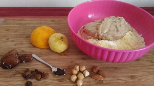 In particolare ho sostituito completamente il malto con frutta essiccata e il cocco con nocciole e mandorle.