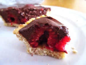 Vi starete chiedendo ma dov’è la foto delle tortine intere? Ahimè non c’è!!! :O … Vuoi che di sera non c’è la luce giusta ;), vuoi che sono così golose che la forchetta è stata più rapida della macchina fotografica … insomma le foto le ho fatte il giorno dopo! Ma non tutti i mali vengono per nuocere 😉 … direi che vedere l’interno della tartelletta con questo lampone bello rosso vivace e succulento, circondato da tanto golosissimo cioccolato rende perfettamente l’idea di questo dessert! 😀 non vi pare?! ;P … spero mi perdonerete! ❤