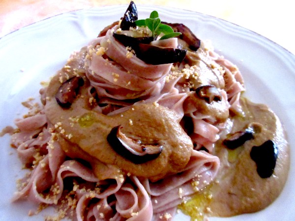 Scolare le tagliatelle condire con la crema ai funghi e guarnire con qualche pezzetto di shitake e una spolverata di nocciola tenuti da parte.