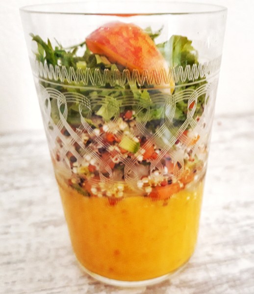 - In un bicchierino mettere sul fondo qualche cucchiaio di gazpacho, aggiungere sopra l’insalata di quinoa, decorare con granella di nocciole.