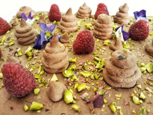 - Tagliare il Pan di Spagna in due parti uguali che poi andremo a sovrapporre. Irrorare generosamente la torta con la bagna. Farcire una metà del pan di sagna con la ganache facendo delle strisce lunghe e lineari vicine lasciando circa 1 cm dai bordi. Coprire con l’altra metà della torta dal lato bagnato. inumidire con un po’ di bagna avanzata anche la parte superiore della torta e guarnire con no strato omogeno di ganache aiutandosi con la pala ad angolo. Infine decorare con lamponi freschi, pinnacoli di ganache e una spolverata di granella di pistacchi tostati.