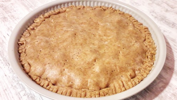 - Stendere il resto dell’impasto e coprire la torta. Bucherellare e chiudere bene con i rebbi di una forchetta. Spennellare con latte vegetale.