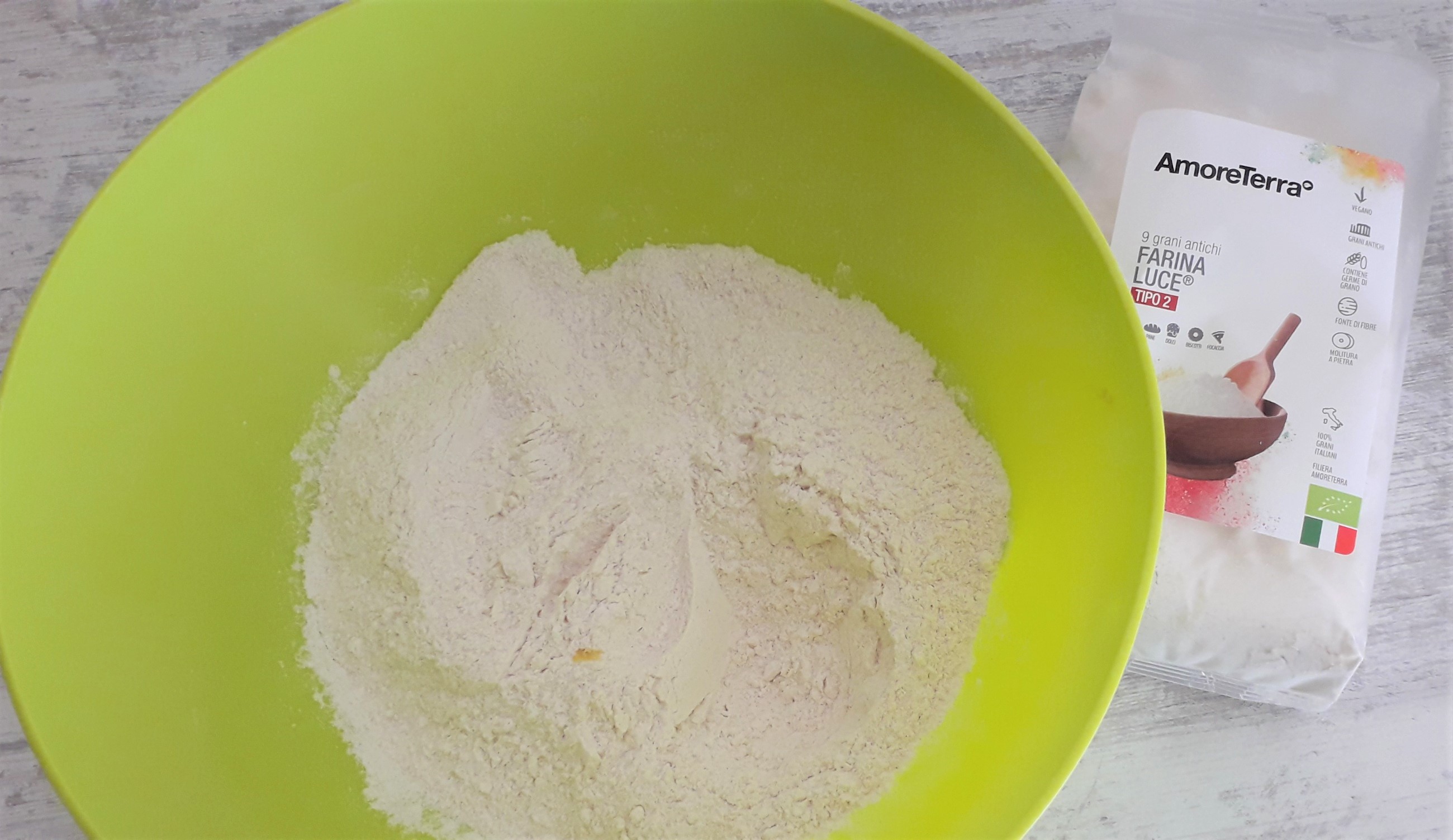 Per le farine, come forse avrete intuito, sono abbastanza fissata, le cerco sempre macinate a pietra, perchè sono meno raffinate, e possibilmente di grani antichi, perchè sono più digeribile e perchè sono più aromatiche e conferiscono alle preparazioni gusto e consistenza unici! Una delle mie favorite è la farina Luce di Amore Terra, ottenuta da ben 9 varietà di grani antichi coltivati insieme in un unico campo … una magia! 😀