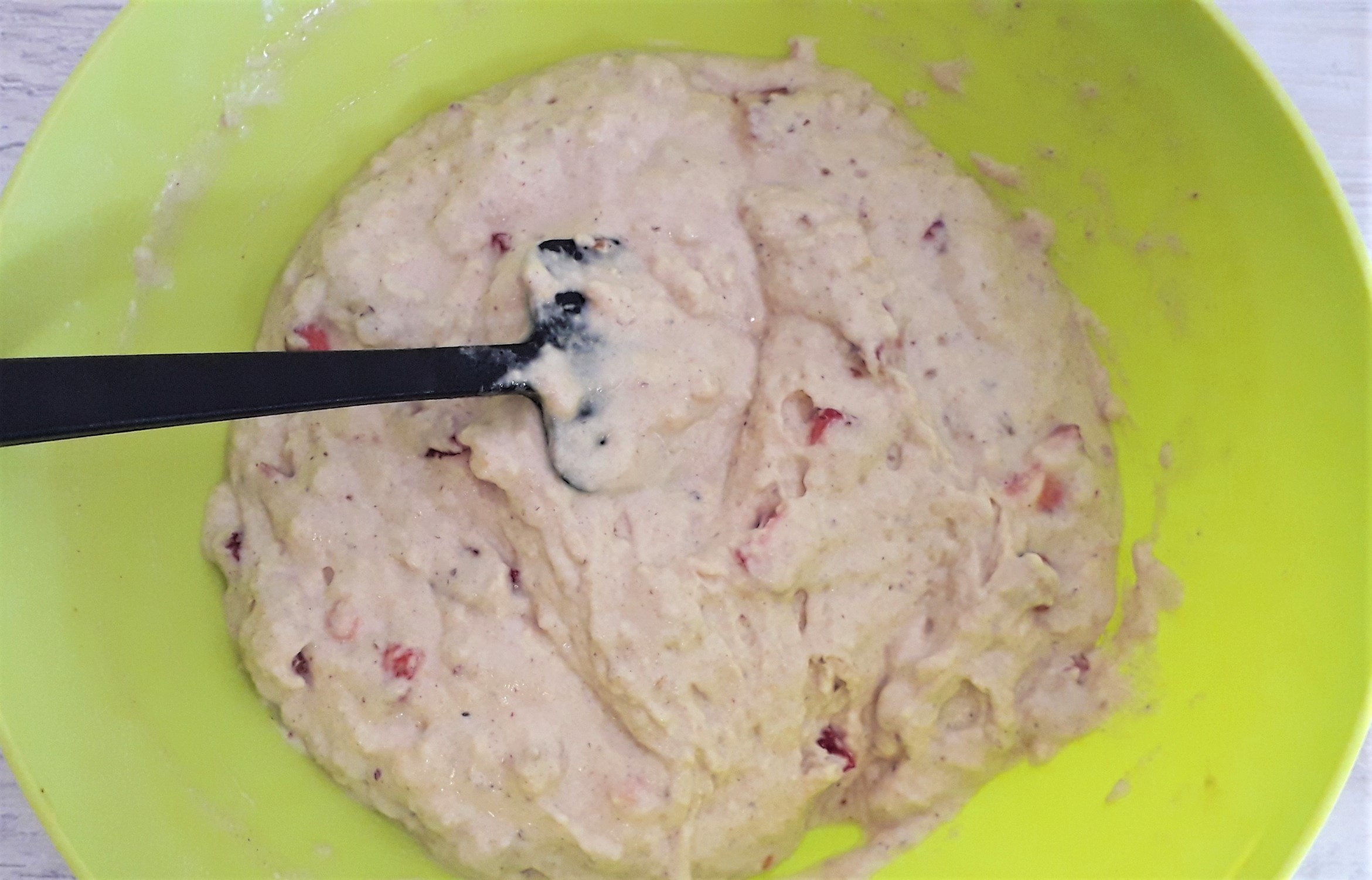 - Tagliare a cubetti 120g di fragole e unirle all’impasto