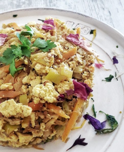 Comunque tornando al nostro tofu strapazzato, una volta preparato, lo potete gustare in accompagnamento ad un riso basmati e a delle verdure a vapore condite con acidulato di umeboshi, oppure lo potete usare per farcire una piadina!
