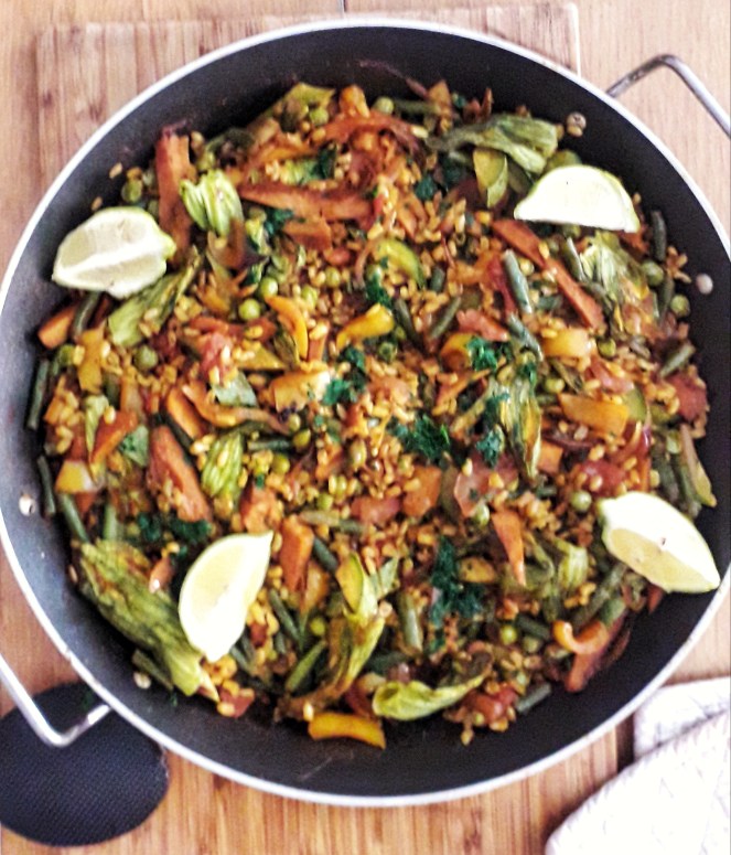 Nella dispensa delle spezie avevo ancora un po’ di mix paella originale, acquistata un paio di anni fa in Spagna, ma in assenza potrai fare un mix con paprica dolce (un pizzico anche di quella affumicata), cumino, zafferano, sommaco, peperoncino se piace.